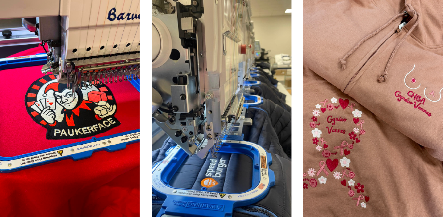 Notre atelier de broderie textile dispose d’une capacité de production de 500 pièces par jour, permettant de répondre rapidement à vos besoins, que ce soit pour des petites ou des moyennes séries, tout en assurant des finitions de qualité.