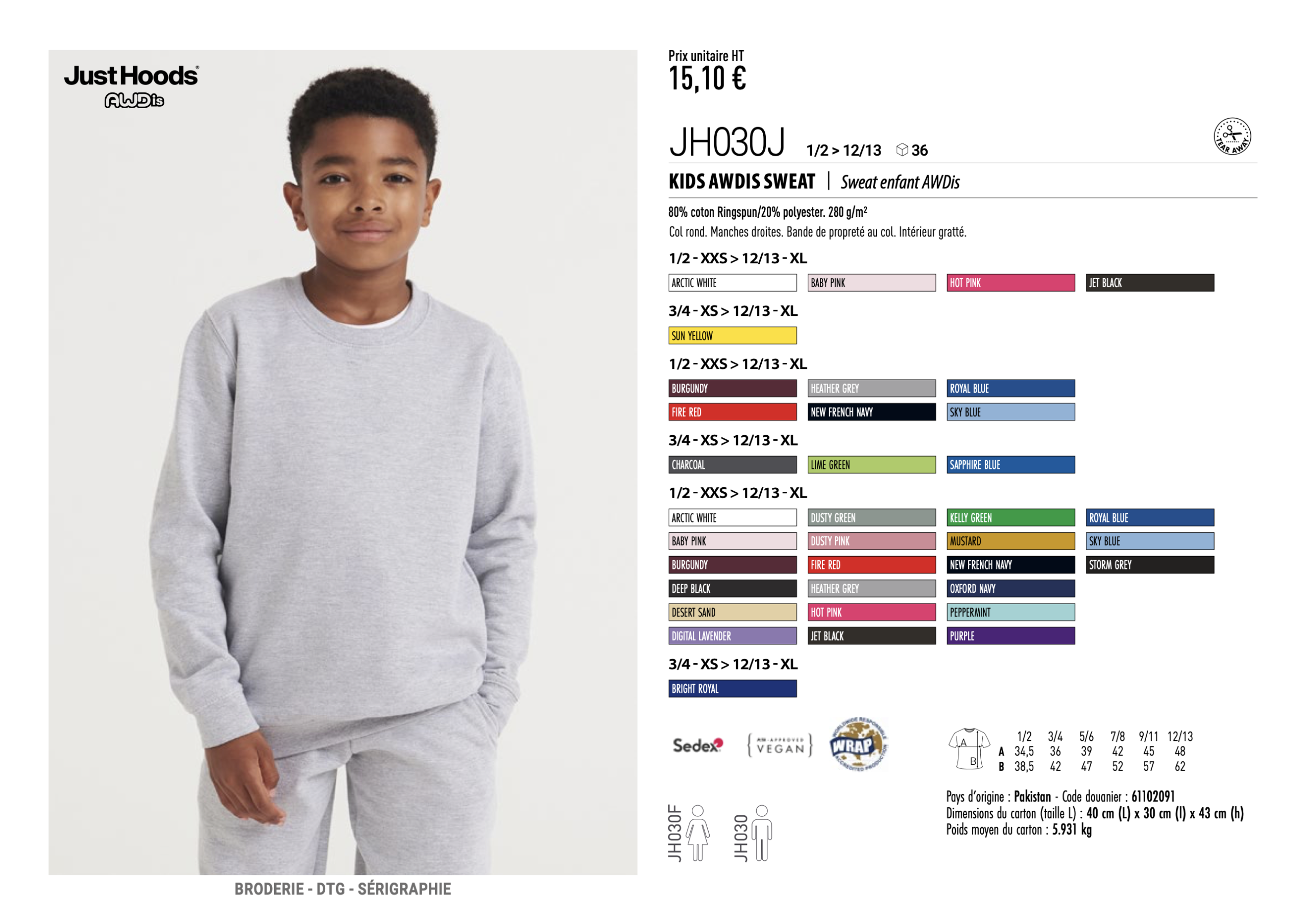 Produit(s) de la même famille : JH030 JH030J Kid Sweat à Col Rond Enfant - 33 Couleurs Qualité et style : Sweat 80% Coton / 20% Polyester - 280 Gr Coupé cousu Production certifiée WRAP (Worldwide Responsible Accredited Production). Couleurs disponibles : Couleur Choisir une optionARCTIC WHITEBABY PINKBRIGHT ROYALBURGUNDYCHARCOALDEEP BLACKDESERT SANDDIGITAL LAVENDERDUSTY GREENDUSTY PINKFIRE REDHEATHER GREYHOT PINKJET BLACKKELLY GREENLIME GREENMUSTARDNEW FRENCH NAVYOXFORD NAVYPEPPERMINTPURPLEROYAL BLUESAPPHIRE BLUESKY BLUESTORM GREYSUN YELLOWEffacer quantité de JH030J Kid Ajouter au panier à partir de 11.50 €