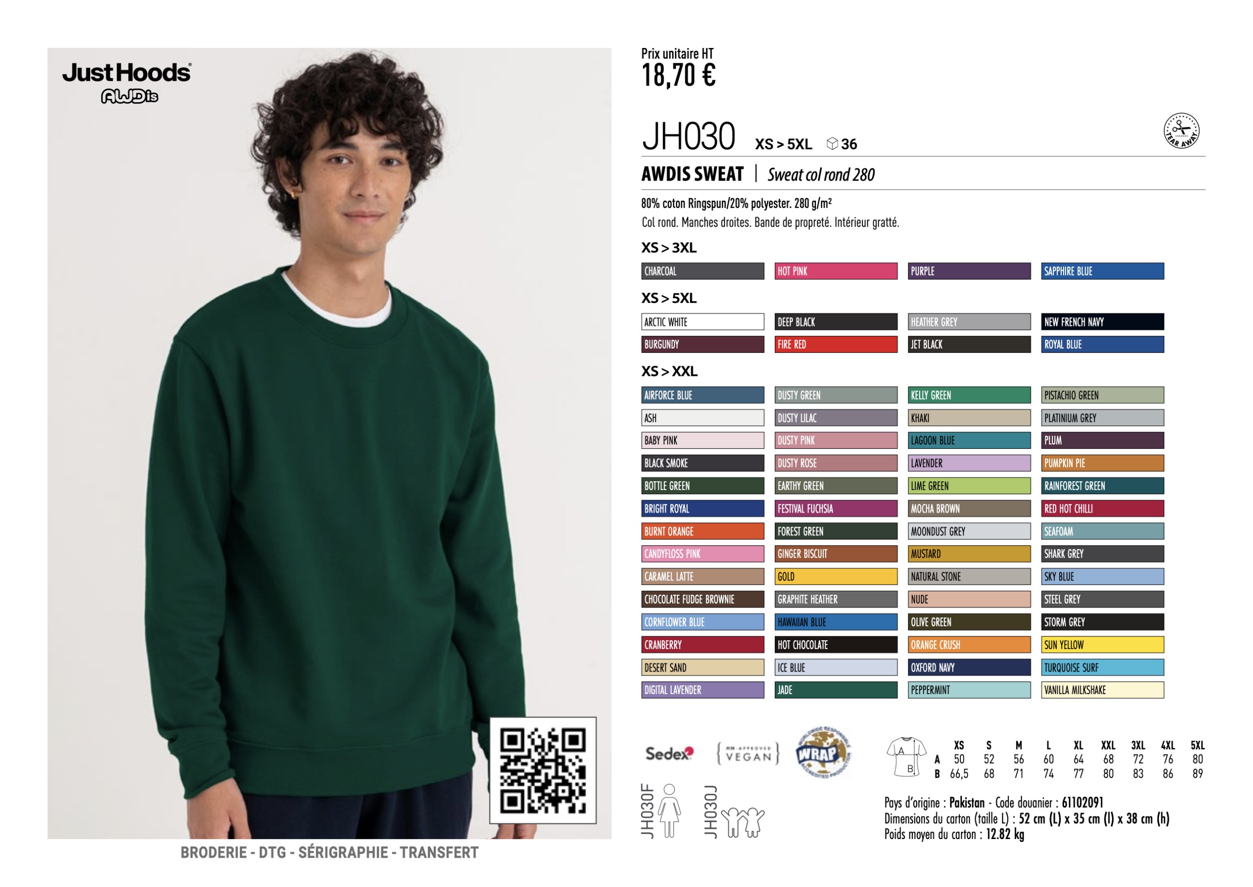 Produit(s) de la même famille : JH030J Kid JH030 Sweat à Col Rond - 50 Couleurs Qualité et style : Sweat 80% Coton / 20% Polyester - 280 Gr Coupé cousu Production certifiée WRAP (Worldwide Responsible Accredited Production). Couleurs disponibles : Couleur Choisir une optionAIRFORCE BLUEARCTIC WHITEASHBABY PINKBLACK SMOKEBOTTLE GREENBRIGHT ROYALBURGUNDYBURNT ORANGECANDYFLOSS PINKCARAMEL LATTECHARCOALCHOCOLATE FUDGE BROWNIECORNFLOWER BLUECRANBERRYDEEP BLACKDESERT SANDDIGITAL LAVENDERDUSTY GREENDUSTY LILACDUSTY PINKDUSTY ROSEEARTHY GREENFESTIVAL FUCHSIAFIRE REDFOREST GREENGINGER BISCUITGOLDGRAPHITE HEATHERHAWAIIAN BLUEHEATHER GREYHOT CHOCOLATEHOT PINKICE BLUEJADEJET BLACKKELLY GREENKHAKILAGOON BLUELAVENDERLIME GREENMOCHA BROWNMOONDUST GREYMUSTARDNATURAL STONENEW FRENCH NAVYNUDEOLIVE GREENORANGE CRUSHOXFORD NAVYPEPPERMINTPISTACHIO GREENPLATINIUM GREYPLUMPUMPKIN PIEPURPLERAINFOREST GREENRED HOT CHILLIROYAL BLUESAPPHIRE BLUESEAFOAMSHARK GREYSKY BLUESTEEL GREYSTORM GREYSUN YELLOWTURQUOISE SURFVANILLA MILKSHAKEEffacer quantité de JH030 Ajouter au panier à partir de 11.50 €